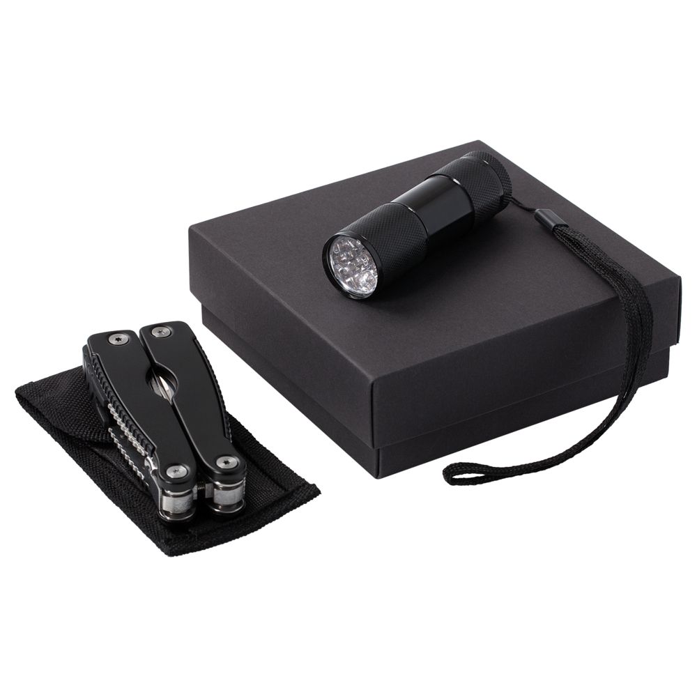 фонарик - алюминий; мультитул: инструменты - нержавеющая сталь; рукоятки - алюминий; чехол - полиэстер; коробка - картон